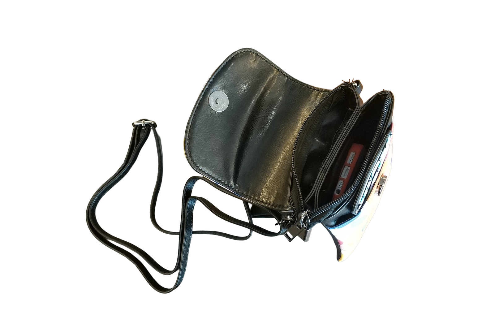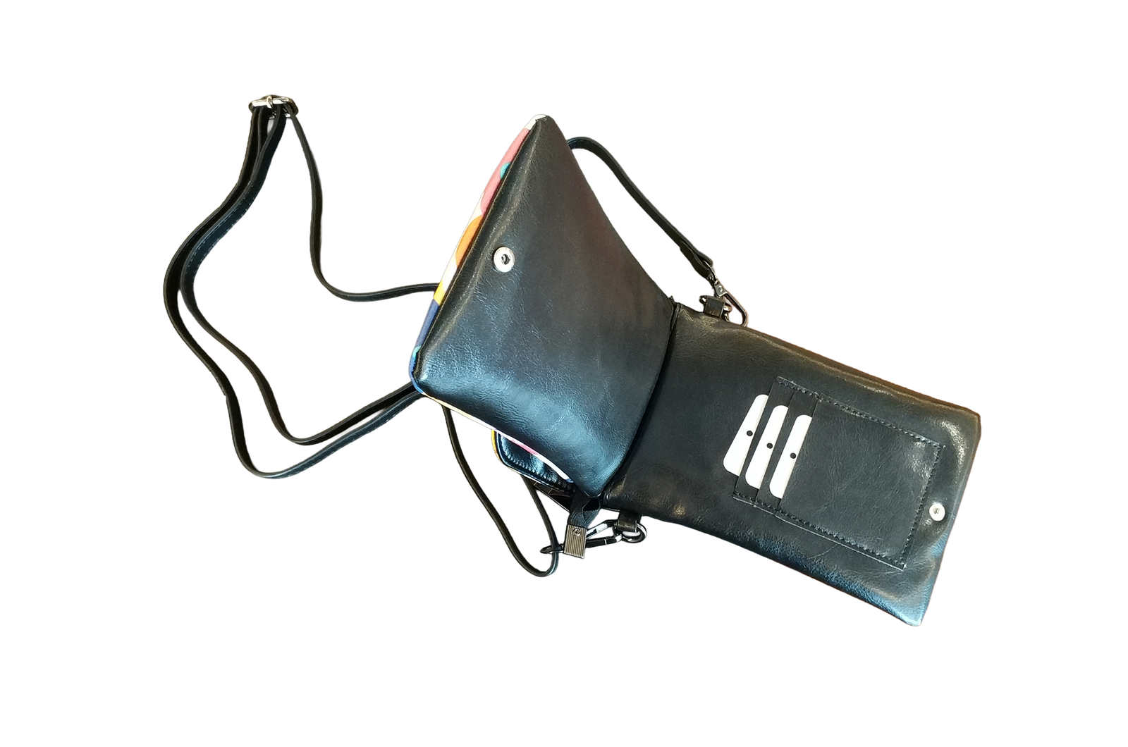 Stay organized with two main flip-up compartments, a secure pocket, three hidden card slots, and multiple closures for added security. Designed with both aesthetics and practicality, the adjustable leather strap ensures a comfortable fit, measuring from approximately 29.6″ to 51.2″.